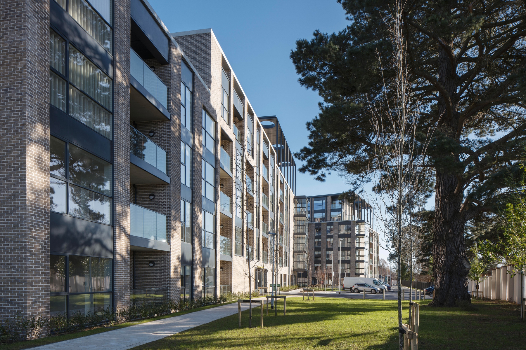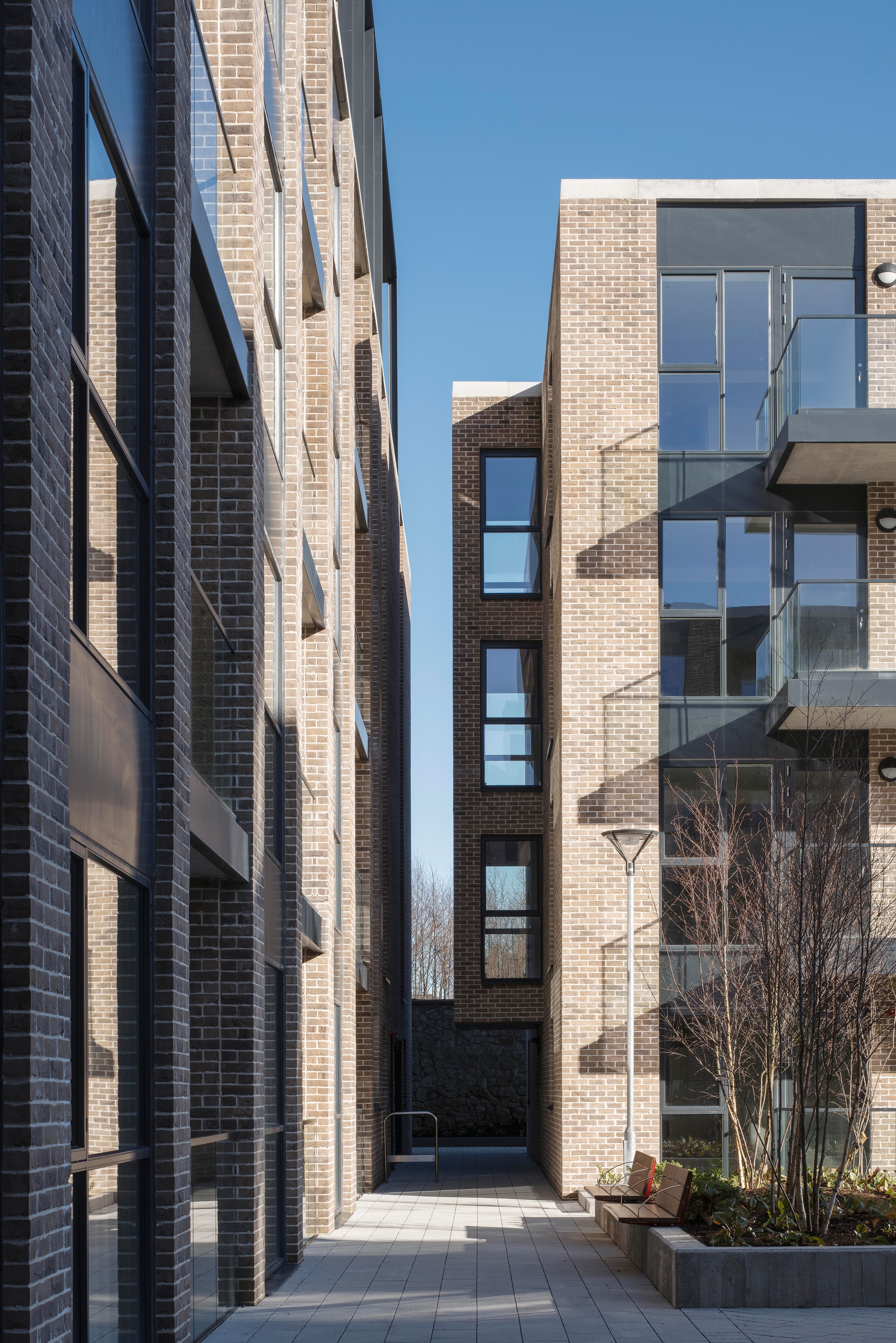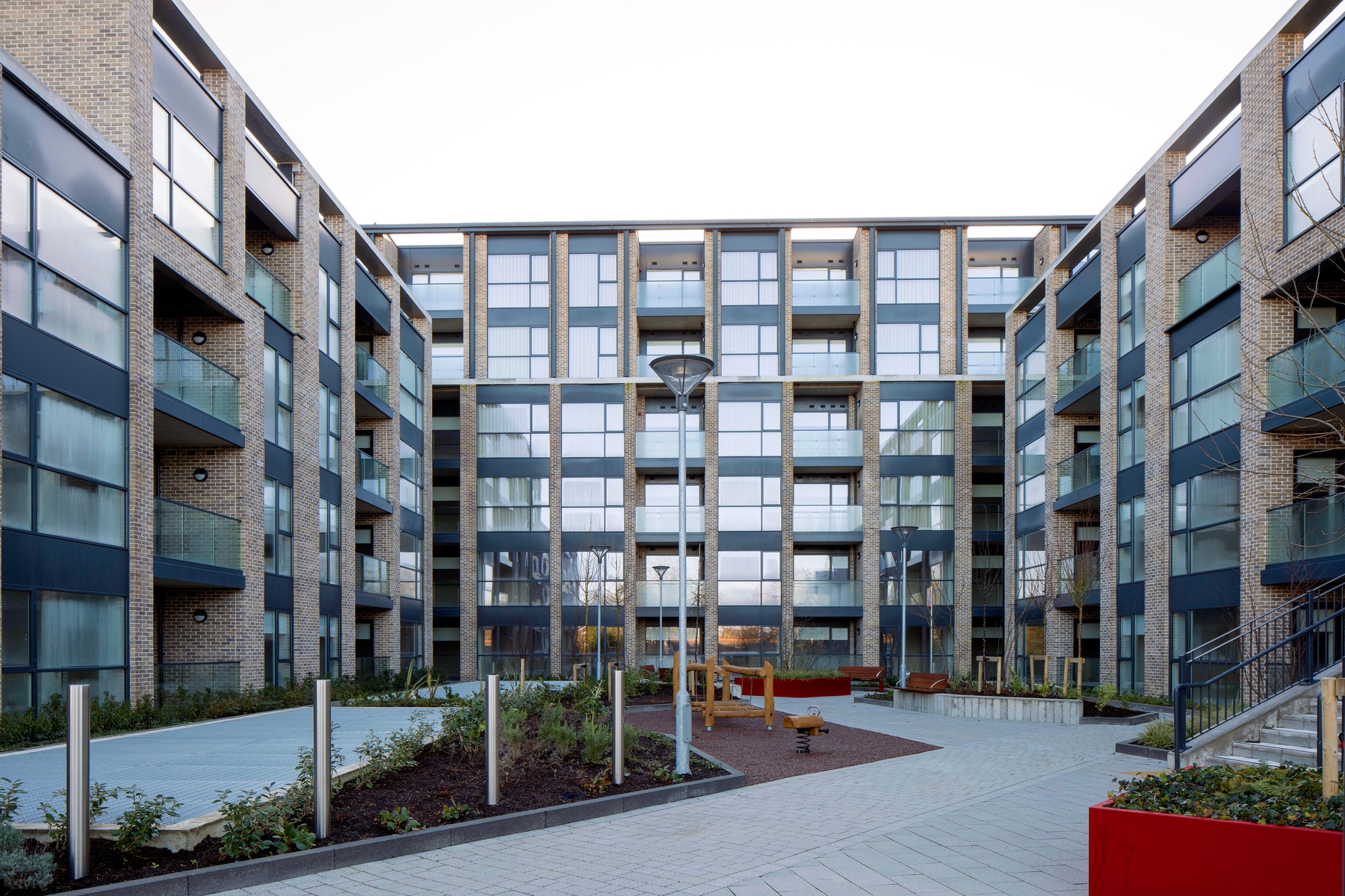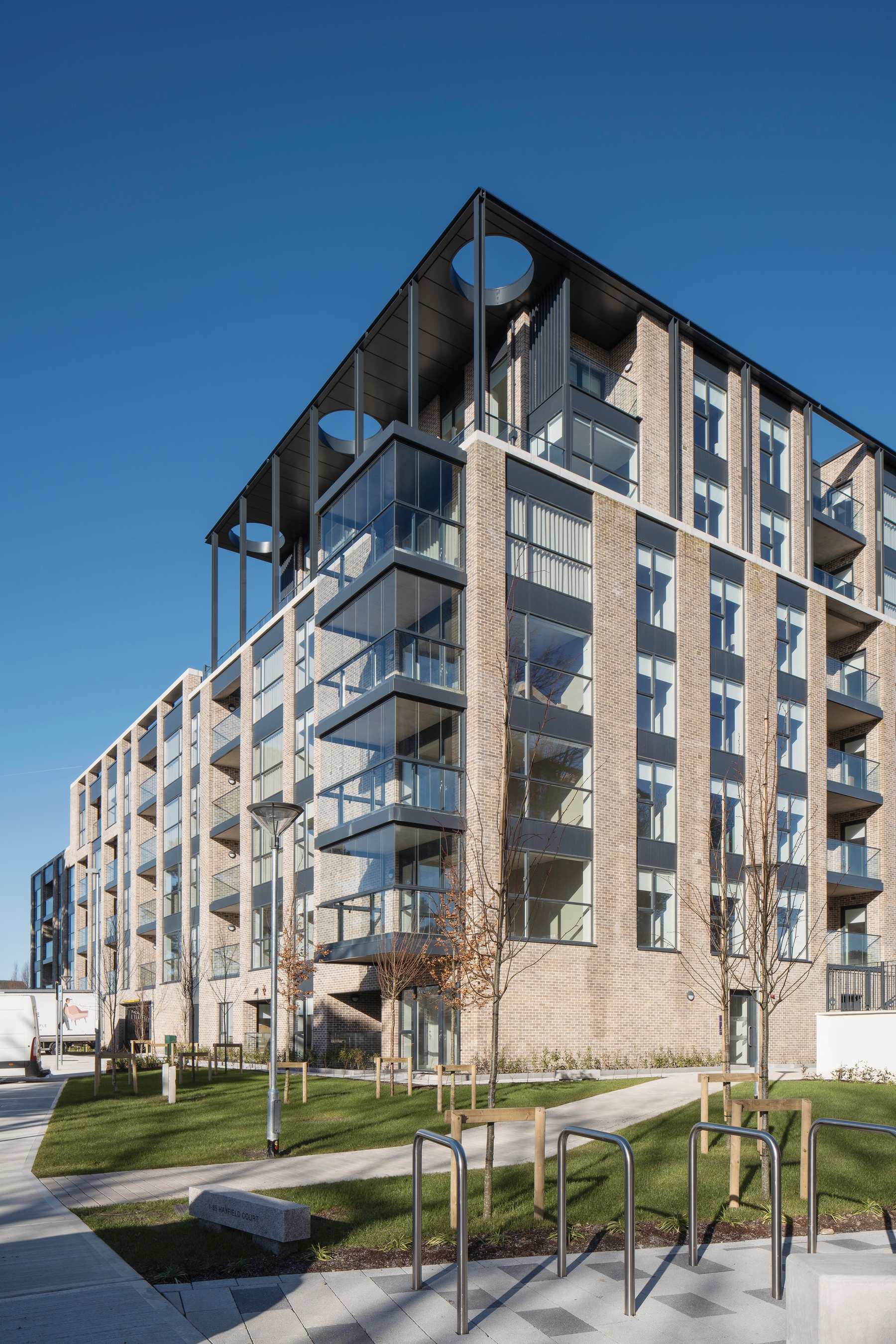 Hayfield is an infill apartment scheme, comprising two courtyard blocks arranged around central gardens. It provides a well-articulated built edge to the Graduate roundabout and acts as a good neighbour in an established two-storey residential context. The scheme is intended for the rental market and is equipped with a generous resident’s amenity facility.