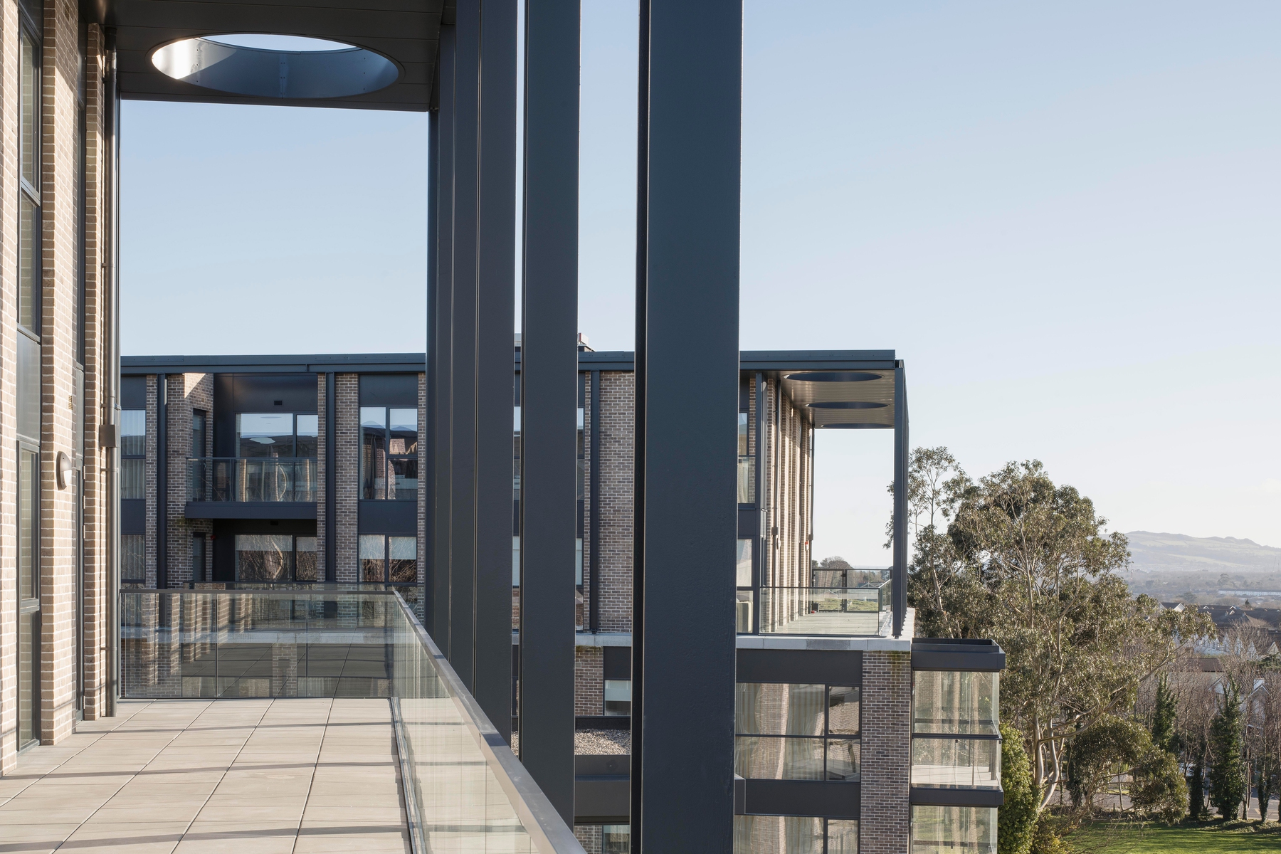 The external facades of the scheme are framed in steel, punctuated by recessed panels of brick. A strong and varied frontage is provided to the Graduate roundabout with a penthouse colonnade topping off the elevation. Large openings in the generous roof overhang allow light to spill down into the apartments below while providing a strong visual edge to the street.