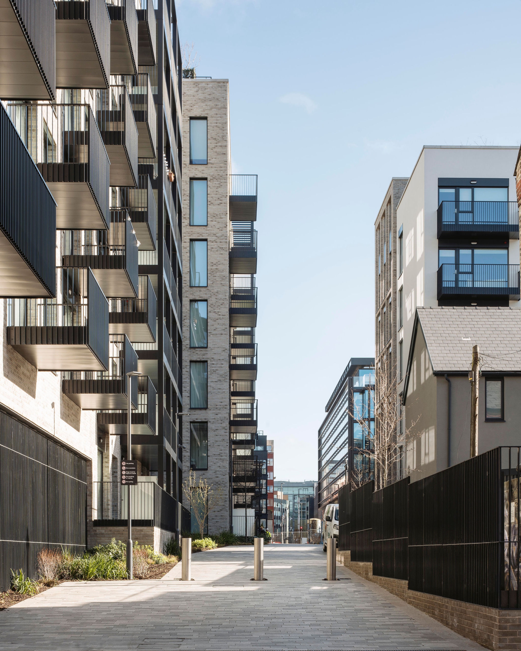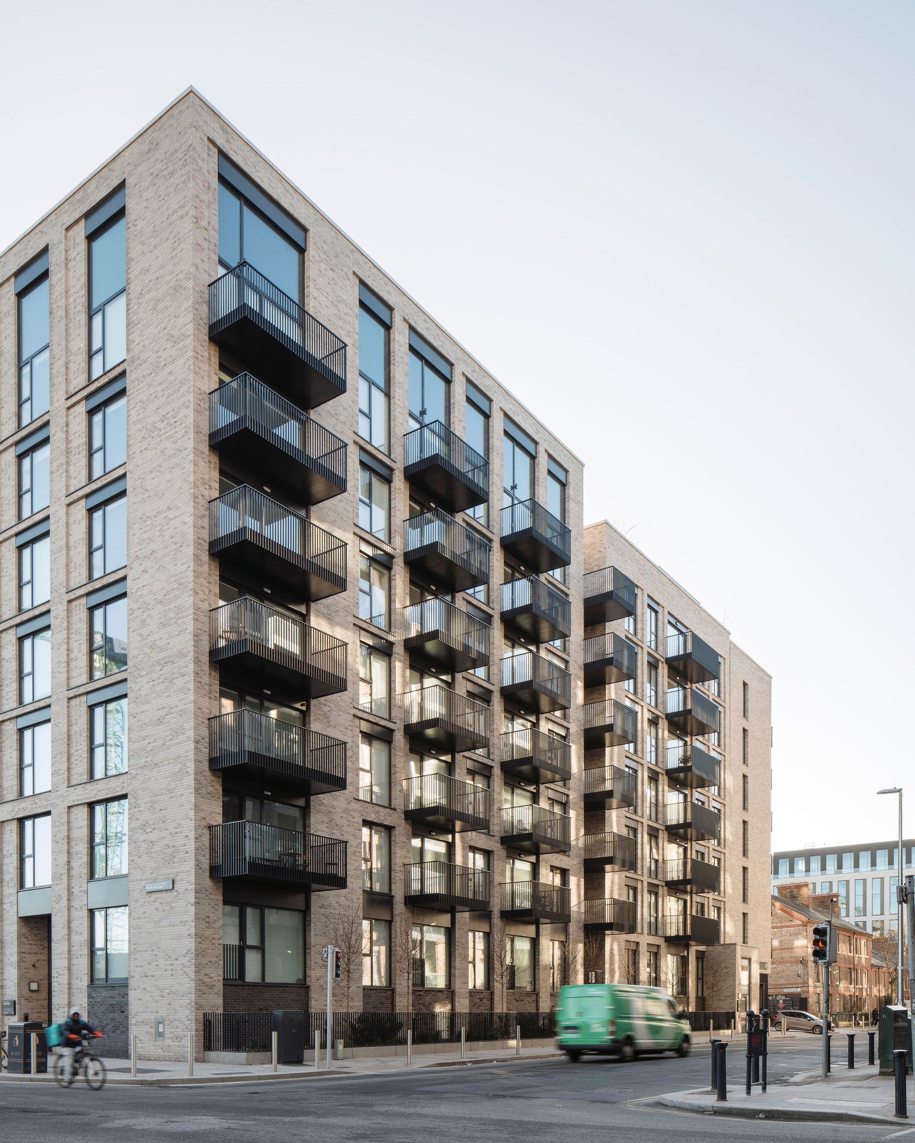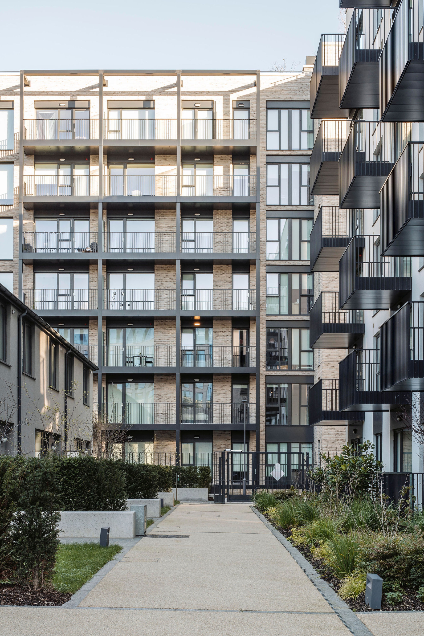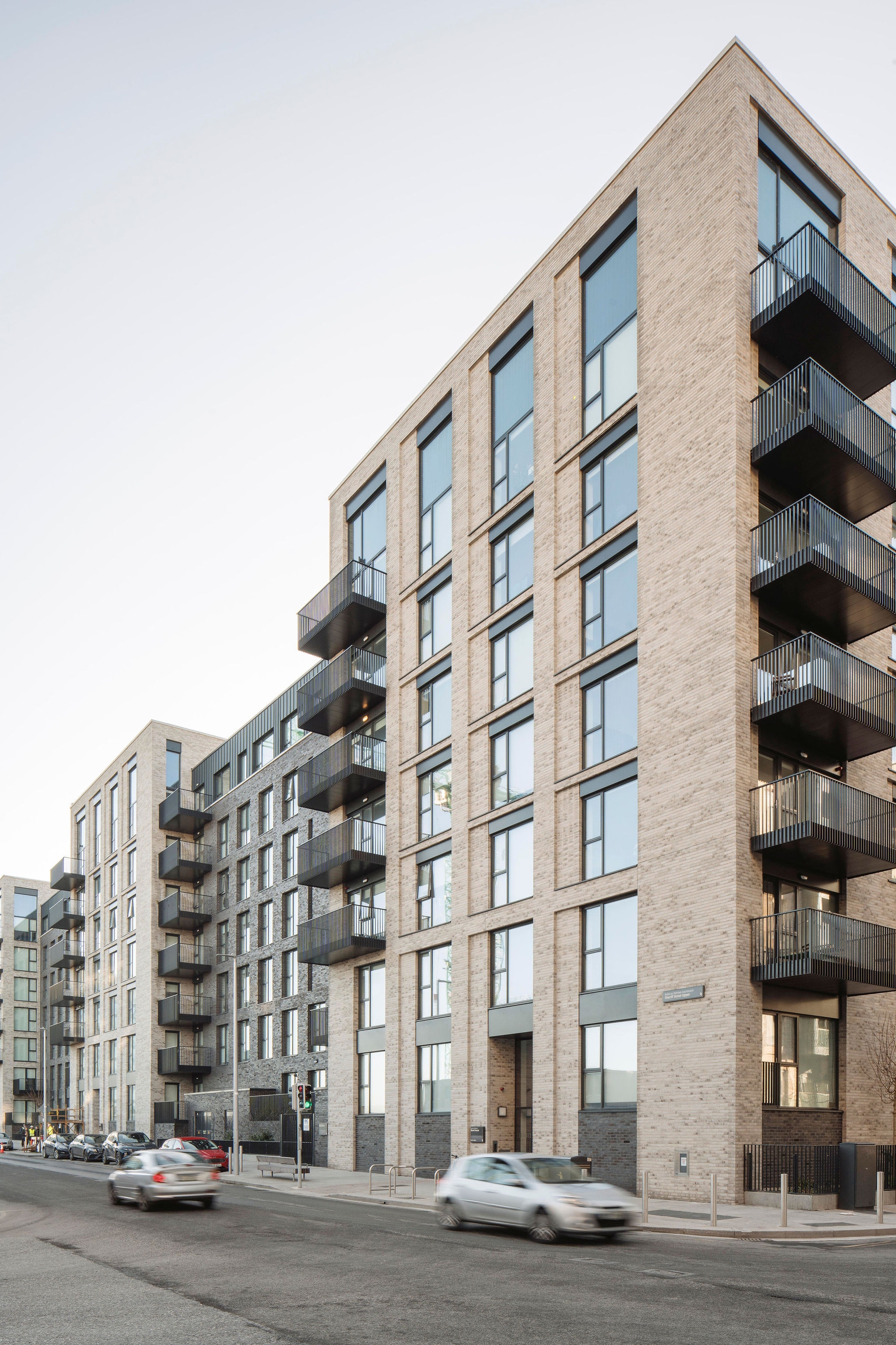 The initial urban strategy was influenced by the existing pattern of development in the docklands which is exemplified by the historic, orthogonal grid laid out in the 18th century. This pattern informed the layout and form of the buildings, open spaces and route ways on the site. The material nature of the scheme takes reference from the existing use of brick in the area, which has traditionally been used in the housing and warehousing in the North Lotts. Variation in the use of brick changes with the scale of the buildings, the proposed houses and smaller scale apartment blocks are clad in brick similar in colour and tone to the existing housing terraces along New Wapping St and Mayor St Upper, while the large scale apartment block is clad in a buff brick similar in colour and tone to the warehousing lining Sheriff St Upper.